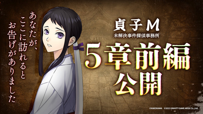 グラビティゲームアライズ株式会社(所在地:東京都中央区)は、スマートフォン・タブレット向け謎解きホラー脱出アドベンチャー『貞子M 未解決事件探偵事務所』において、本日2022年4月27日(水)より、新章【5章『異能』前編 】を公開いたしました。また、本日より端午の節句イベント「端午に彷徨う鎧武者」を開催いたします。