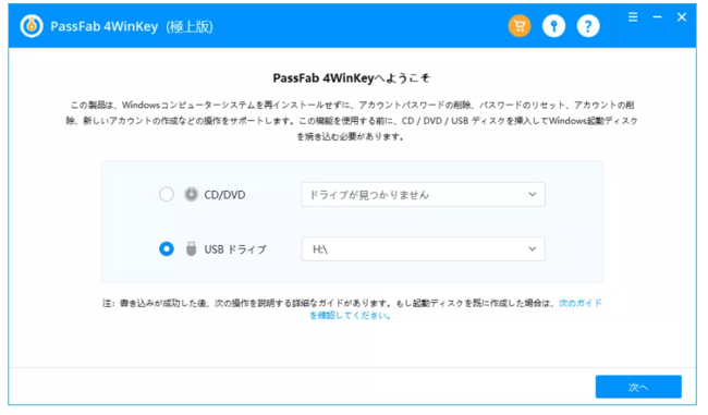 別のパソコンでPassFab 4WinKeyを起動してCD/DVD/USBドライブなどを接続、読み込まれたメディアを選択し「次へ」をクリックします。