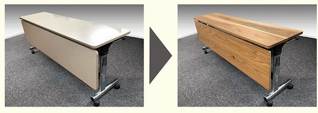 メラミン化粧板などで製作された既存の会議用テーブルの天板や幕板を、スギの大径材を活用した「Gywood(R)」による無垢の板材へ交換することによって、室内空間のウッドチェンジを手軽に実現できます。