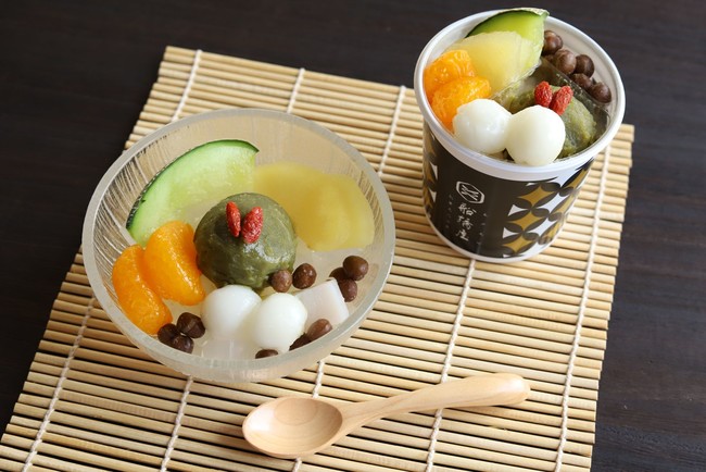 内容:寒天、抹茶餡、赤えんどう豆、林檎の蜜煮、メロン、みかん、クコの実、くず餅、白玉