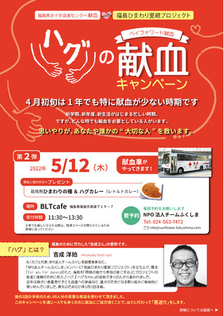 「ハグ」こと吉成洋拍は、当法人の副理事を務め、東日本大震災から倒れる直前まで共に福島のために尽力し、昨年5月に病気で永眠しました。生前手術をする際に、大量に血液が必要と知り、献血をSNSで呼びかけると、県内外の沢山の方が献血センターへ足を運んでくださいました。