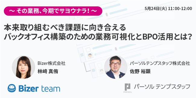 総合人材サービスのパーソルグループで人材派遣・アウトソーシング事業を手掛けるパーソルテンプスタッフ株式会社(本社: 東京都渋谷区、代表取締役社長: 木村 和成、以下パーソルテンプスタッフ)は、ビジネス支援クラウドサービス「Bizer」「Bizer team」の開発・運営を行っているBizer株式会社と(本社: 東京都千代田区、代表: 畠山 友一、以下Bizer社)共催で、5月24日(火)に「~その業務、今期でサヨウナラ!~本来取り組むべき課題に向き合える バックオフィス構築のための業務可視化とBPO活用とは?」をテーマに、オンラインセミナーを開催します。