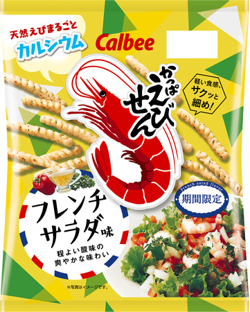 ●フレンチサラダらしい程よい酸味と香味野菜の風味が後引く、初夏にピッタリの爽やかな味わいの「かっぱえびせん」です。軽い食感が楽しめるように、通常の「かっぱえびせん」より細めの生地に仕上げました。