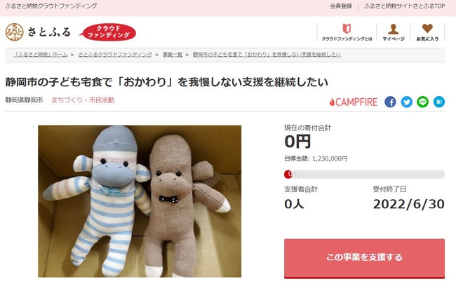 静岡県静岡市とふるさと納税ポータルサイト「さとふる」(https://www.satofull.jp/)を運営する株式会社さとふる(本社:東京都中央区、代表取締役社長:藤井 宏明)は、寄付金の使途に応じて事業を立ち上げ寄付を募る「さとふるクラウドファンディング」(https://www.satofull.jp/projects/top.php)にて、生活に困窮する子育て中の家庭へ食品などの配達を定期的に行う「子ども宅食」事業を継続するため、2022年5月13日より寄付受け付けを開始します。静岡市はこれまでに「さとふるクラウドファンディング」で、本件を含め34事業の寄付募集を行っています。