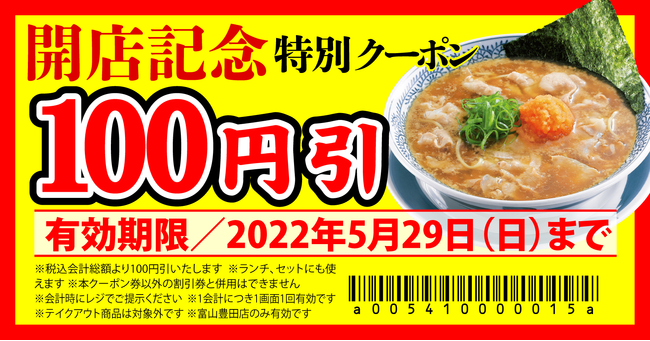 株式会社物語コーポレーション(本社:愛知県豊橋市/代表取締役社長:加藤 央之)が運営する『丸源ラーメン』は、2022年5月20日(金)に、全国181店舗目となる『丸源ラーメン 富山豊田店』(富山県富山市)をグランドオープンいたします。オープン記念として、2022年5月29日(日)まで『丸源ラーメン 富山豊田店』のみでご利用いただける100円引クーポンを配布します。