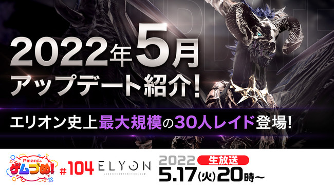 5月17日(火)20時よりYouTubeのPmangチャンネルにて、「【ELYON公式】新作MMORPG『ELYON(エリオン)』5月 アップデート紹介!【Pmangのゲムづめ!#104】」を配信いたします。