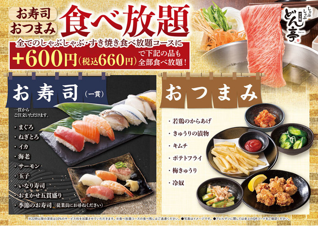 ランチメニューの食べ放題コース(税抜価格1,890円~)でもグランドメニューの食べ放題コース(税抜価格1,990円~)でもお一人様プラス600円(税込660円)で、120分間のしゃぶしゃぶ又はすきやき食べ放題に加え、まぐろや海老などのお寿司10品目・ポテトフライやからあげなどのおつまみ6品目が全てお替り自由でお楽しみいただけます。