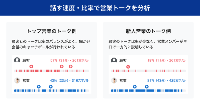 営業における成約率の向上においては成約/失注要因の分析が欠かせませんが、成約/失注の要因として、営業パーソンのトーク内容と話す割合(話者比率)、および話す速度(話速)の分析などがあげられます。