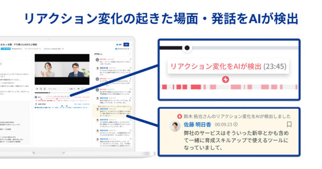 また、表情や動きから感情変化をAIが特定するリアクション解析の機能もリリースいたしました。リアクション解析を用いることで、商談においてリアクションが大きかった点を特定し、営業パーソンが言いよどんだ点や、商談が盛り上がった点などを社内で共有しナレッジとして蓄積いただくことが可能になります。