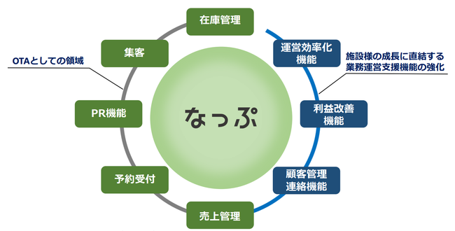 キャンプ場検索・予約サイト「なっぷ」の運営、アウトドアの力を活用した日本全国の未活用不動産、公園などの活性化、公設キャンプ場のリニューアルを行い、アウトドア体験をより身近に、多くの方に体験いただけるよう展開を行っています。