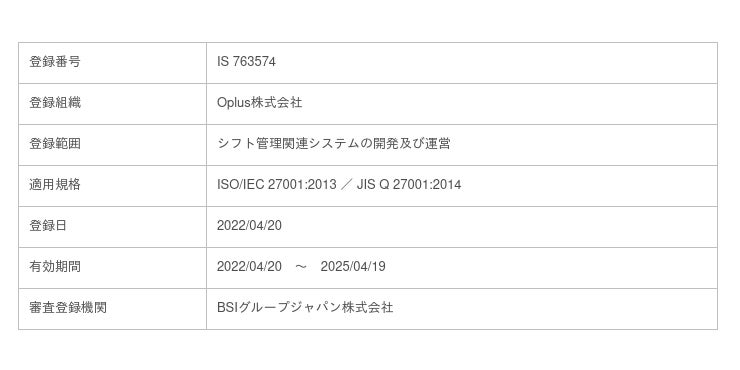 ブラウザ・スマホ・アプリの全てに対応したクラウド型シフト/勤怠管理サービス「oplus(オプラス)」が情報セキュリティマネジメントシステム(ISMS:Information Security Management System)の国際規格である「ISO/IEC 27001:2013 / JIS Q 27001:2014」の認証を2022年4月20日付で取得いたしました。