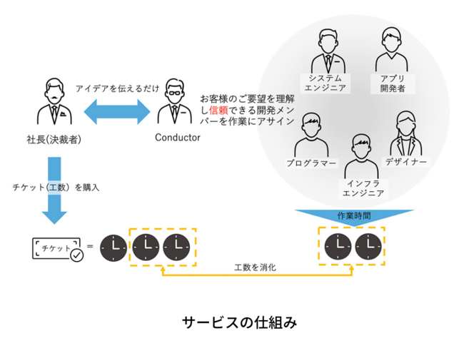 i-Conductorはチケット(工数)をご購入いただきそのチケットの範囲内でコンサルティング、人材・インフラ環境確保、開発を行います。その為、体制や環境を維持する毎月の固定費が不要となりランニングコストを削減できます。