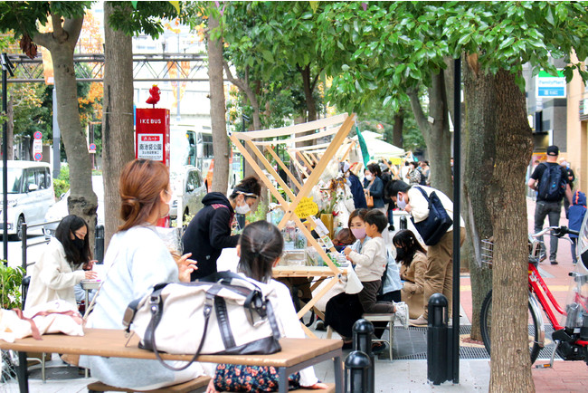 日常を彩るマーケットとして、グリーン大通りの一部で地元の作家や飲食店、池袋駅沿線の生産者などが出店します。屋台の間にファニチャーを並べて、買い物をしながら寛げる空間づくりも行います。