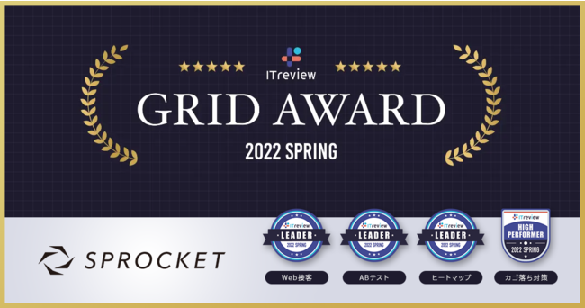 株式会社Sprocket(本社:東京都目黒区、代表取締役:深田 浩嗣)は、アイティクラウド株式会社が運営するIT製品レビュープラットフォーム「ITreview(アイティレビュー)」の「ITreview Grid Award 2022 Spring」において、ユーザーより認知度・満足度共に優れた製品であると評価され、「Web接客」「 ABテスト」「 ヒートマップ」の総合3部門にて最高位の「Leader」を受賞いたしました。