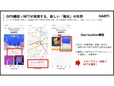 当社は4月に出品完全審査制NFTプラットフォーム「HARTi」(以下、HARTiアプリ)をリリースしました。HARTiアプリは、社会性/成長性の高いNFTアートプロジェクトのみをリスティング、アプリ内で完結する独自の「HARTi Wallet」を搭載した、日本で最も高品質なNFTプラットフォームを目指しています。また大きな特徴の1つとしてGeo-location機能(GPSによるユーザー位置特定)により、特定の場所に来た顧客のみにNFTを配布することが可能となりました(当社による特許出願中)。