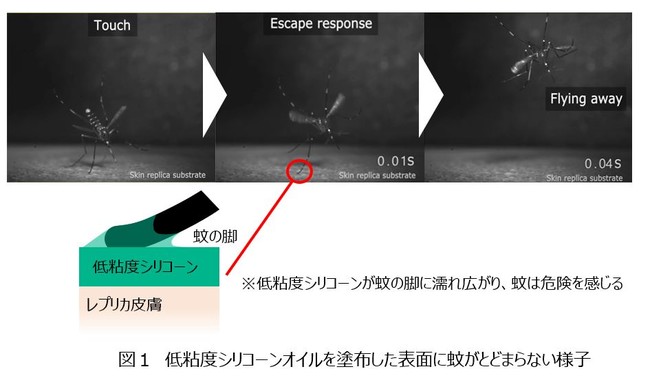 これまでに花王は、低粘度シリコーンオイルを塗布することで蚊の嫌う肌表面を作り、蚊に刺されることを防ぐ技術を報告しています※3。化粧品に一般的に使用される低粘度シリコーンオイルを塗布した皮膚では、蚊の降着時間が短くなります。これは低粘度シリコーンオイルが蚊の脚にすばやく濡れ広がることで蚊の脚に引力が生じ、逃避行動を誘発するためと考えられます(図1)。