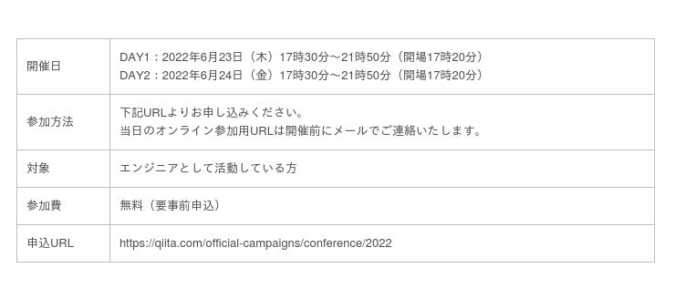 株式会社エイチームのグループ会社であるQiita株式会社(本社:名古屋市中村区、代表取締役社長:柴田健介)は、2022年6月23日(木)、6月24日(金)に2日連続でエンジニア向けのオンラインイベント「Qiita Conference 2022(キータ カンファレンス 2022)」を開催します。