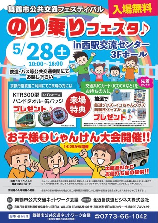 舞鶴市公共交通フェスティバル『のり乗りフェスタ♪』は、鉄道・バス・タクシー・フェリーなど舞鶴市内の公共交通が大集合して、ステージイベントをはじめ、各交通事業者によるブース展示やNゲージの運転体験、北海道からフェリーに乗ってやってきた物産販売や今年全線開通100周年を迎えるJR小浜線の写真展示など盛りだくさんのイベントです。