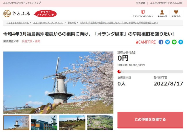 宮城県登米市とさとふる、令和4年3月福島県沖地震で被災した長沼フートピア公園の「オランダ風車」を復旧するため、寄付受け付けを開始