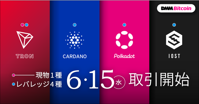 DMMグループの株式会社DMM Bitcoin(本社:東京都中央区、代表取締役社長:田口 仁、暗号資産交換業 関東財務局長 第00010号、第一種金融商品取引業 関東財務局長(金商) 第3189号 https://bitcoin.dmm.com/ )は、6月15日(水)より、以下のとおり現物取引において新たに「トロン(TRX)」及びレバレッジ取引において新たに4種類の暗号資産の取扱いを開始いたします。