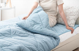 同シリーズの冷感キルトケットも発売しました。キルトケットは接触冷感+吸放湿性で「さらひや」を実現し、敷パッドと同様に制菌・三大消臭機能もあり、冷感生地とパイル生地のリバーシブルでオールシーズンご使用いただける仕様となっております。