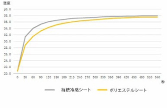 この持続冷感シートは、検査機関においてもその効果を実証しております。持続冷感シートと市販のポリエステルシートとの比較実験をしています。2つの試験体を同時に温度20度、湿度60%の環境に置いて温度を計測した結果、通常のポリエステルシートよりも温度が上がるまでの時間を抑える効果が確認できました。