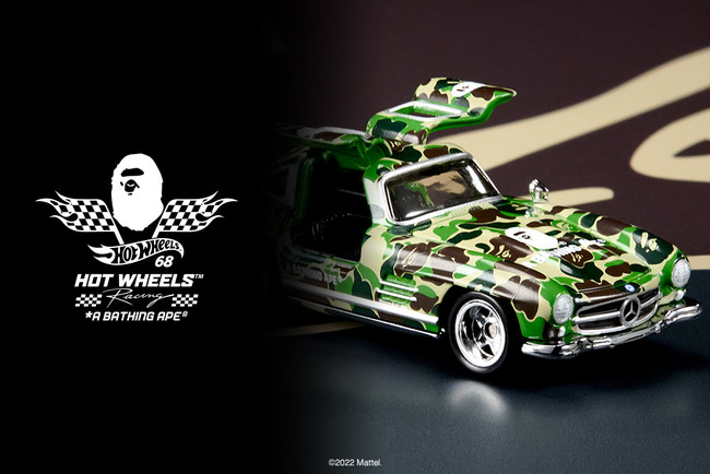 HOT WHEELSとBAPE(R)︎によるジャンルの壁を越えたコラボワークでは、ストリートの感性とミニカーの遊び心が高次元で融合したアイテムが誕生。両者のアイデンティティを色濃く反映しているTシャツやメッシュキャップに加え、ドイツが誇る自動車メーカー Mercedes-Benzの高級スポーツカー、SLクラスの初代モデル「300SL」をベースとしたトリプルネームのミニカーをご用意しました。