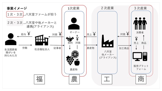 八天堂として福祉や農業の「お役に立ちたい」という想いから、約5年前より、福祉関連事業として就労支援や、農福連携にも取り組んでいます。新会社ではこれまで培った経験を元に、民間企業として1次産業「農」と3次産業「商」を担いながら、2次産業「工」は八天堂や他メーカーとアライアンスを結び、持続可能な利益循環構造の構築を目指します。従事される障がいを持たれた方等の雇用機会の創出・給与の向上や、農業領域・現代社会が抱える課題の解決を推進することで、地域・社会の一助となれるよう努めてまいります。