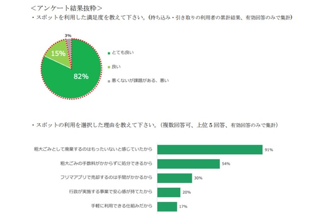今回の取組みに関して利用者へのアンケートを実施した結果、利用の満足度においては「とても良い」、「良い」を選んだ回答者が約97%おり、高い評価を得る取組みとなっておりました。利用した理由に関しても、「粗大ごみとして廃棄するのはもったいないと感じていたから」とする回答が約91%にも上り、リユースに関しての行動や意識啓発の促進になっていることが顕在化する結果となりました(注3)。
