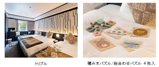 ファミリーでのご利用に最適な常設ベッドを3台配したお部屋に、お子様がお愉しみいただける玩具やらくがき帳代わりにも使えるメモパッドなどのアイテムをご用意しております。