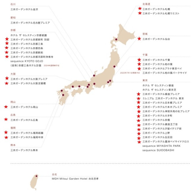 三井不動産ホテルマネジメントは、現在、アッパーミドルクラスの宿泊主体型ホテルである「三井ガーデンホテルズ」を32施設、ハイクラスの宿泊主体型ホテルである「ザ セレスティンホテルズ」を3施設、次世代型新ホテルブランド「sequence(シークエンス)」を3施設の国内38施設、「MGH Mitsui Garden Hotel 台北忠孝」の国外1施設を運営しています。今後も「記憶に残るホテル」「感性豊かなお客様の五感を満たすホテル」という理念・コンセプトのもと、ホスピタリティ溢れるサービスを提供してまいります。