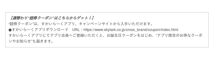 ●すかいらーくアプリダウンロード URL:https://www.skylark.co.jp/cross_brand/coupon/index.html