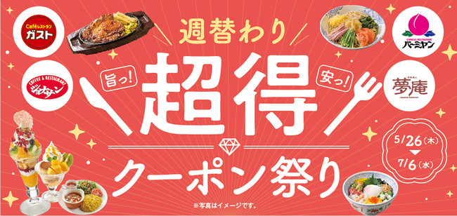 株式会社すかいらーくレストランツ(本社・東京都武蔵野市、代表取締役社長 大川原利明)が運営するすかいらーく4ブランド全2,063店舗で、2022年5月26日(木)から「週替わり超得クーポン祭り」を開催いたします。