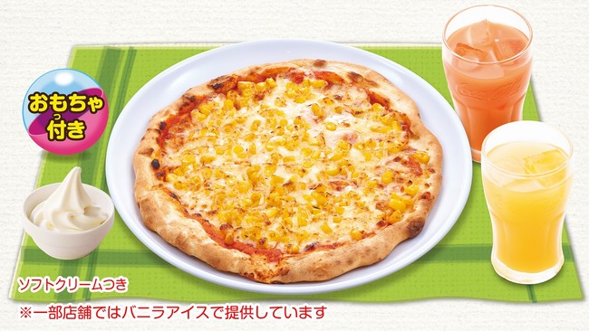 ガストの定番メニュー「マヨコーンピザ」にお子さまドリンクバー、ソフトクリーム、おもちゃが付いた、小学生以下のお子さま限定特別メニュー。