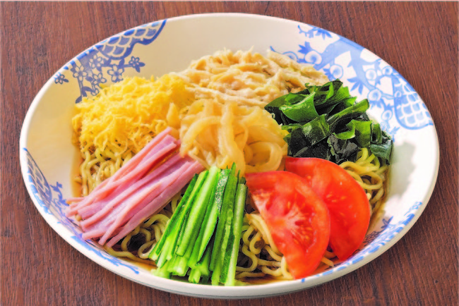 きくらげ、トマト、きゅうり、ハム、玉子など7種の具材を盛りつけた冷やし中華。彩り豊かに仕立てた、暑くなるこれからの時期にピッタリな、さっぱり王道の味わい。