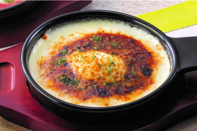 アツアツのチーズがとろける濃厚ソースのミートドリアに、とろっと温玉をトッピング。とろける卵黄と濃厚なドリアの味わいの組合せは、相性抜群!