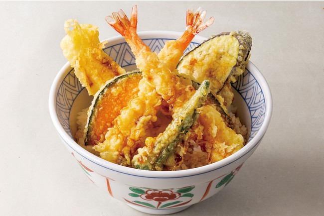 海老やいか、おくら、かぼちゃなど5種類の天ぷらをのせた天丼。天ぷらは、夢庵のこだわりが詰まった自慢の人気メニューです。