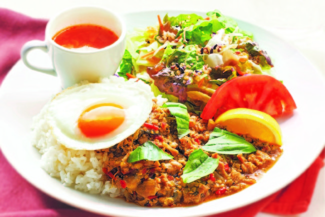 ピリッとした辛さと、バジルの香り、溢れる旨味がベストマッチなガパオライス。キヌアサラダとトマトスープがついたワンプレートメニューです。