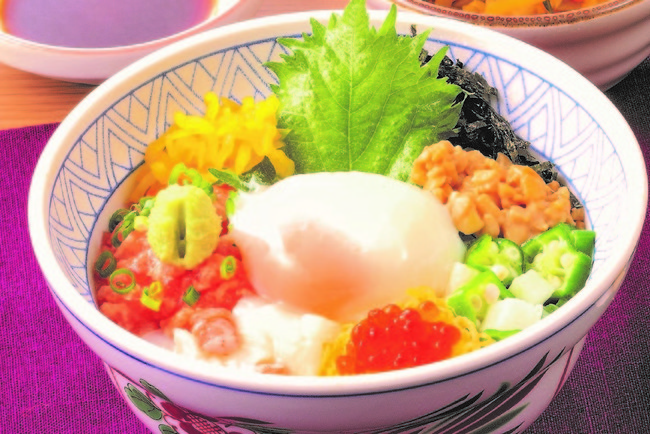 10種類以上の具材が入った、「夢庵といえば」な看板メニューです。海老やイカ、オクラ、納豆、たくわんなどを温玉とともに混ぜてお召し上がりください。