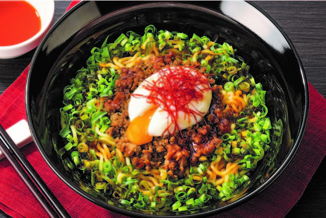 シビ辛ッ!な花椒(ホアジャオ)と麻辣油の辛さが、初夏の食欲そそる味わい。トッピングされた温玉やねぎと一緒に、麺とよく混ぜたら、その味はヤミツキ!