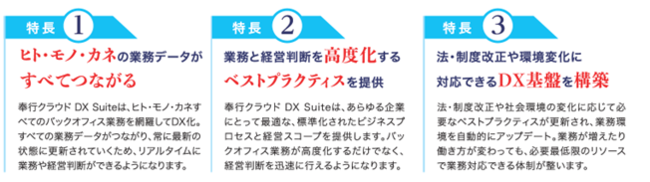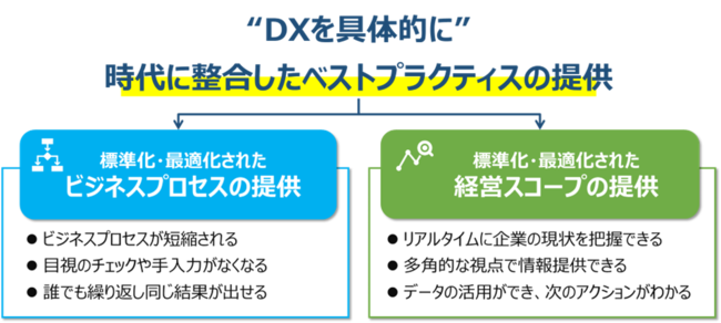『奉行クラウド DX Suite』は、これまで経理・人事労務・販売管理の業務領域で培ってきたベストプラクティスをもとに、標準化・最適化されたビジネスプロセスを提供し、あらゆる企業のバックオフィス業務をDX化します。また、標準化・最適化された経営スコープの提供によって、より迅速に、あらゆる経営指標がリアルタイムに手に入る環境を提供します。