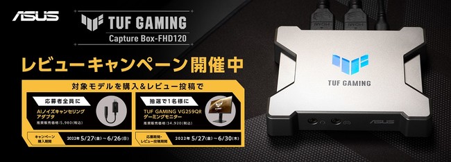 ASUS JAPAN株式会社はASUSのTUF GAMING CAPTURE BOX-FHD120を購入・レビューを投稿した方全員に、AIノイズキャンセリングアダプタをプレゼントする「キャプチャボックスレビューキャンペーン」を開催を発表しました。