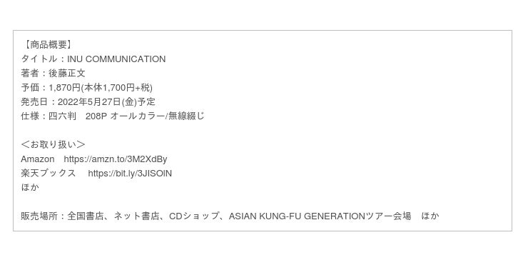 後藤正文著『INU COMMUNICATION』本日発売 & 1週間限定一部無料公開 ~アジカンツアー会場にて特典付き本、サイン本販売~