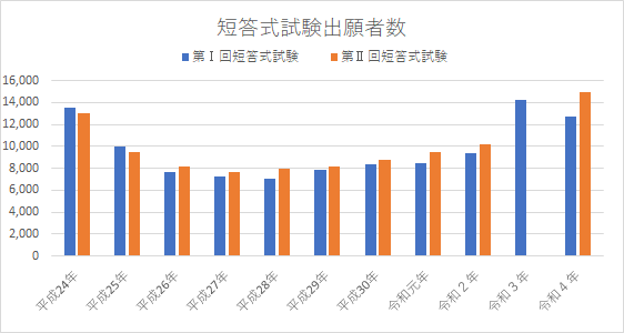 令和4年第II回短答式試験の出願者数は、過去10年で最多の14,958名にのぼりました。昨年はコロナの影響で試験スケジュールが大きく崩れ、短答式試験が1回のみとなりましたが、令和2年の第II回短答式試験と比べると、出願者は4,767名も増加しています。依然「会計士不足」が続いている中、出願者数が大幅に増えており、公認会計士への注目度はますます高まっています。