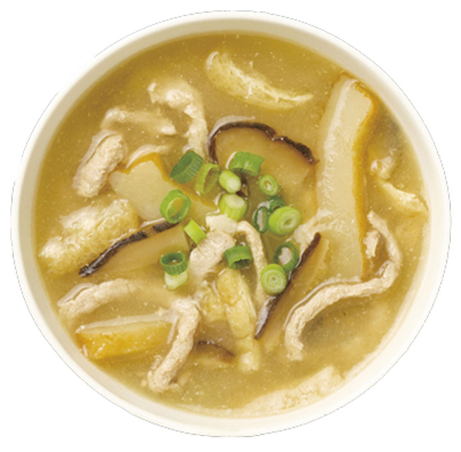 豚肉、さつまあげ、椎茸などが入った白みそ仕立てのお味噌汁です。