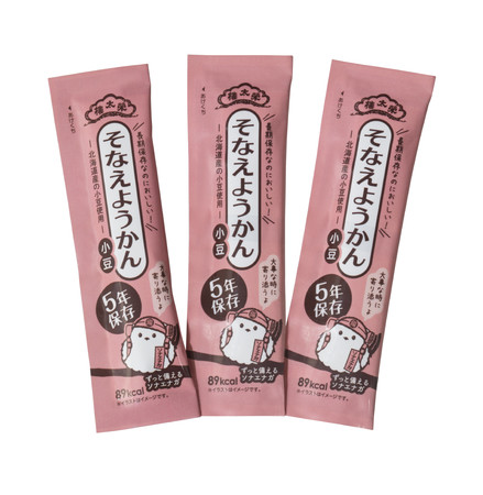 災害時でも美味しいものを食べてもらいたいという思いから、北海道産小豆を使用し原料にもこだわった、なめらかな食感の美味しい羊羹です。手を汚さず、片手でひとくちサイズで食べられる仕立て。