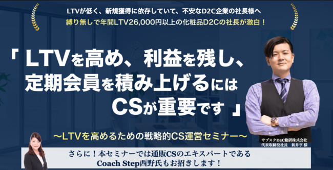 LTV低下や新規獲得への依存で不安を抱くD2C企業の社長様へ。縛りなしで年間LTV26,000円以上の化粧品D2C社長が激白!D2C総研、(株)CoachStep、スタークス(株)とのセミナーを開催!