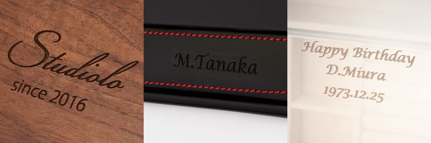 2021年に導入したレーザー彫刻機にて、皮革(PVCは使用不可)・木材・アクリルなどへの刻印加工が可能となりました。ご自身や大切な方のイニシャルや記念日などを刻印し、より特別感のある一品に。一つ一つ丁寧に刻印してお届けします。