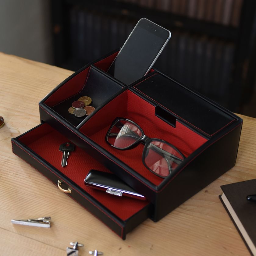 オーバーナイターとは、携帯電話、時計、メガネ、鍵、小銭など普段使いの小物を一晩(オーバーナイト)あずかってくれる便利な収納ケースです。機能的に収納できる為、探し物をする手間がはぶけて便利です。お手持ちの小物をお好みの位置に収納でき、コレクションケースとしてもお使いいただけます。