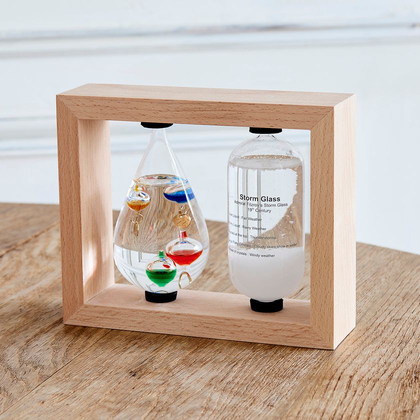 気象状況によって結晶の形が変化する、「ストームグラス(気象予報計)」、気温によってガラス球体が浮き沈みする「ガラスフロート温度計(通称:ガリレオ温度計)」がセットになったアイテム。